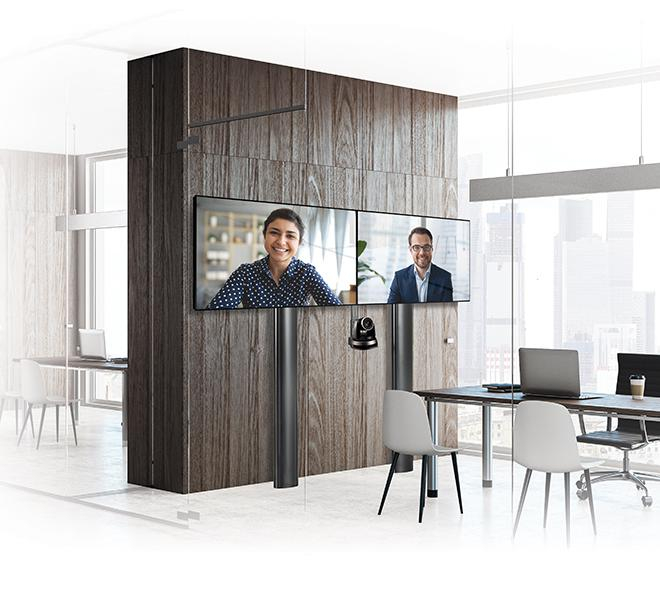 Stand de podea cu fixare in perete B-Tech, pentru doua display-uri cu diagonala 56-65", suporta pana la 70kg (per ecran), inaltime stand 2m, VESA pana la 600x400, include polita pentru montarea camerei de videoconferinta, cable management integrat, include suruburi de blocare a ecranelor pentru a preveni demontarea neautorizata a acestora, negru